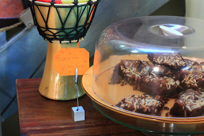 De entre o bolo de banana, o brownie, o bolo de pistachio e o de mousse de chocolate, escolhemos (OBVIAMENTE), duas fatias deste último. Para acompanhar, estávamos indecisos com os sumos por serem tantos, tão coloridos e apetitosos. Desde logo, o responsável pelo pequeno espaço onde se encontram dispostas todas as frutas, se prontificou a explicar um por um, todos aqueles recipientes de líquidos deliciosos. Experimentámos um com laranja e outro com gengibre e abacaxi, acabando por trazer dois copos deste último.