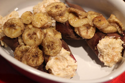 Como a banana já estava pronta, coloquei por cima das batatas juntamente com o molho delicioso que se formou.