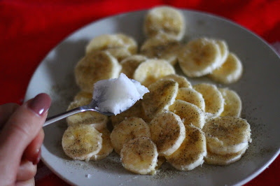 Entretanto fui cortando uma banana e temperando com sal, pimenta e uma colher de café de óleo de coco.